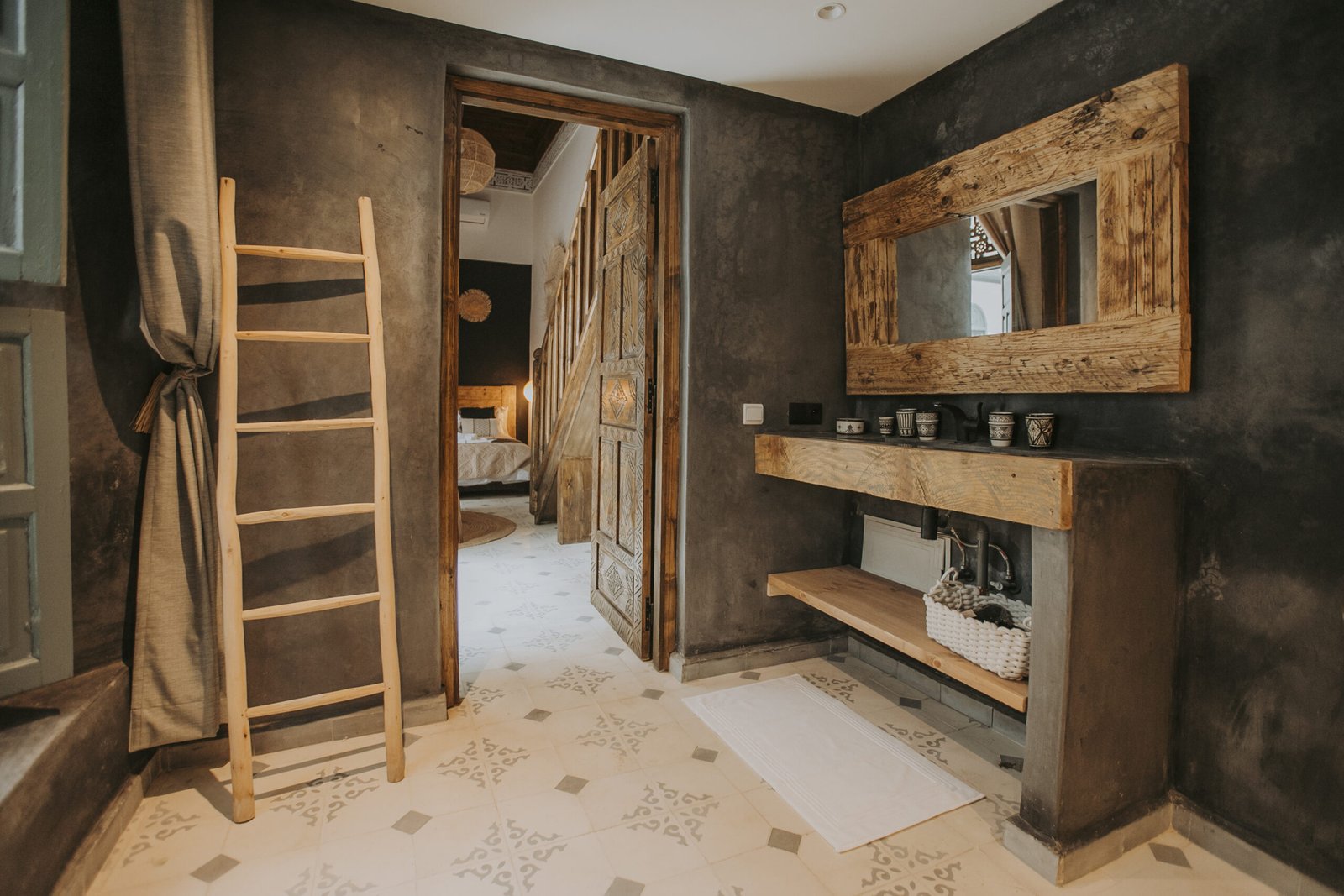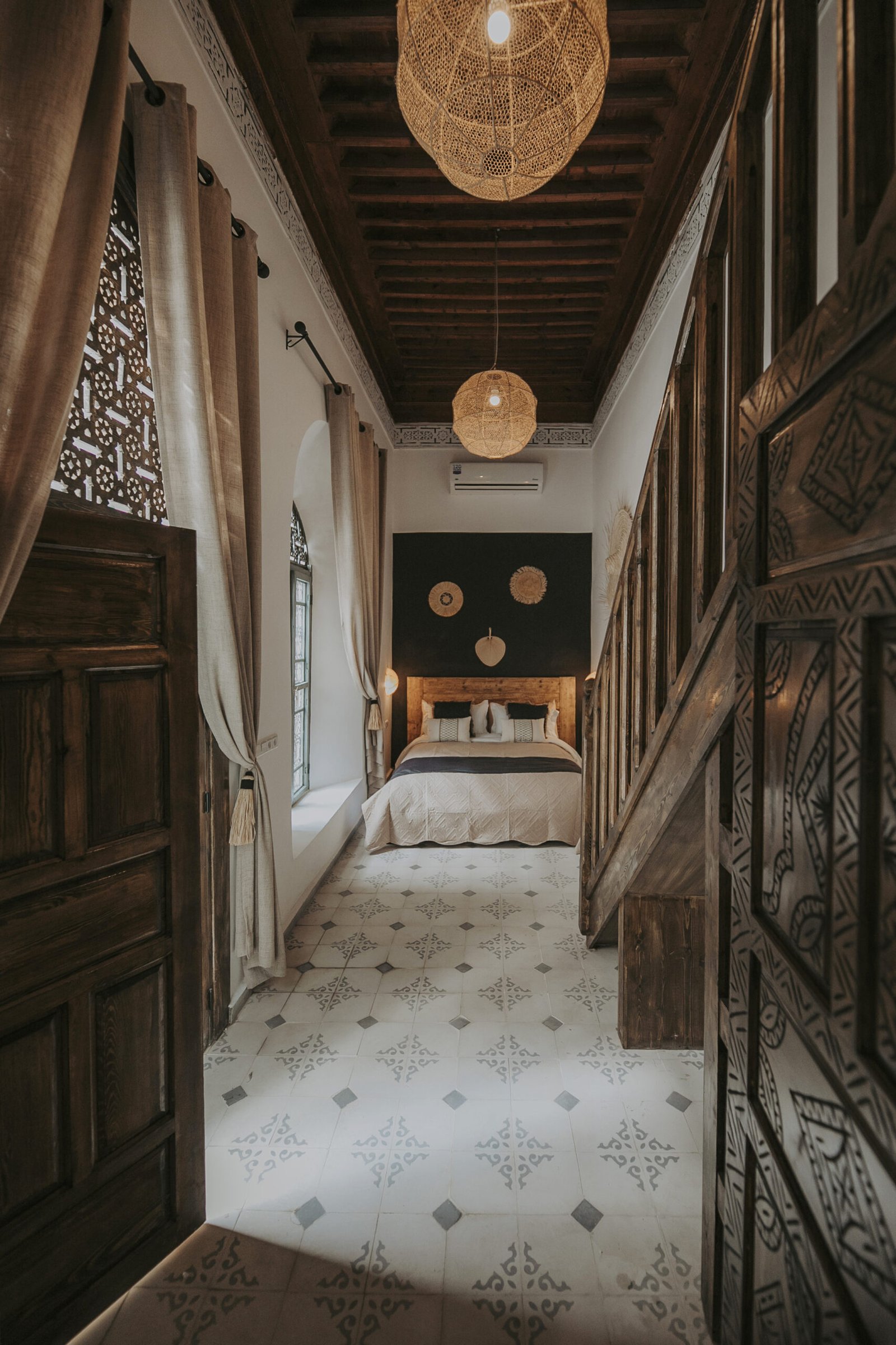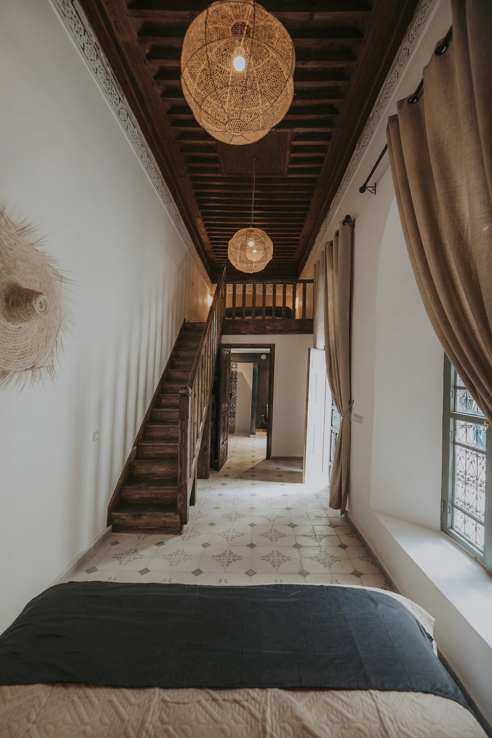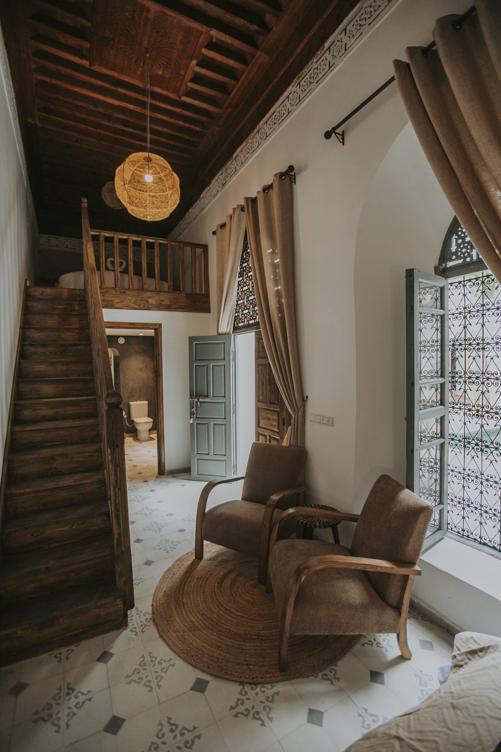 Located on the upper floor, the Toubkal Master Suite (35 m²) is a spacious and inviting duplex designed for comfort and privacy. With two queen-size beds (or four single beds on request), the room is spread over two levels, offering flexible sleeping arrangements. Warm natural tones, raw wood finishes and handwoven lighting fixtures create a serene atmosphere. The stylish, Berber-inspired bathroom completes the space beautifully.