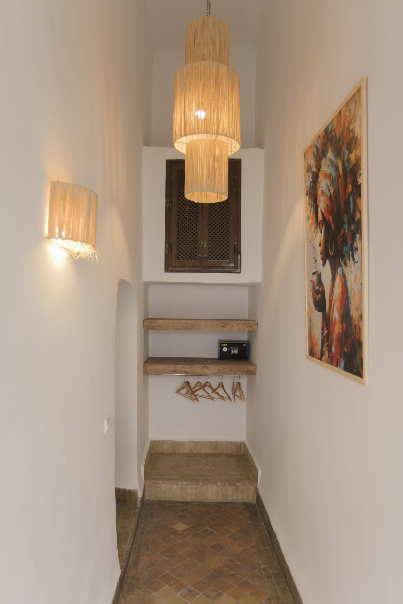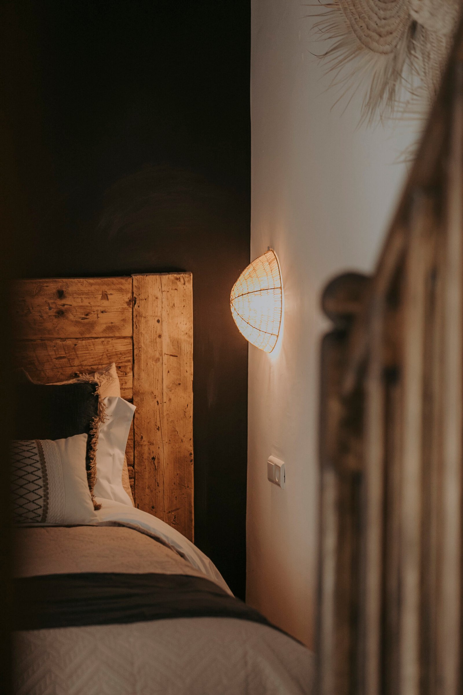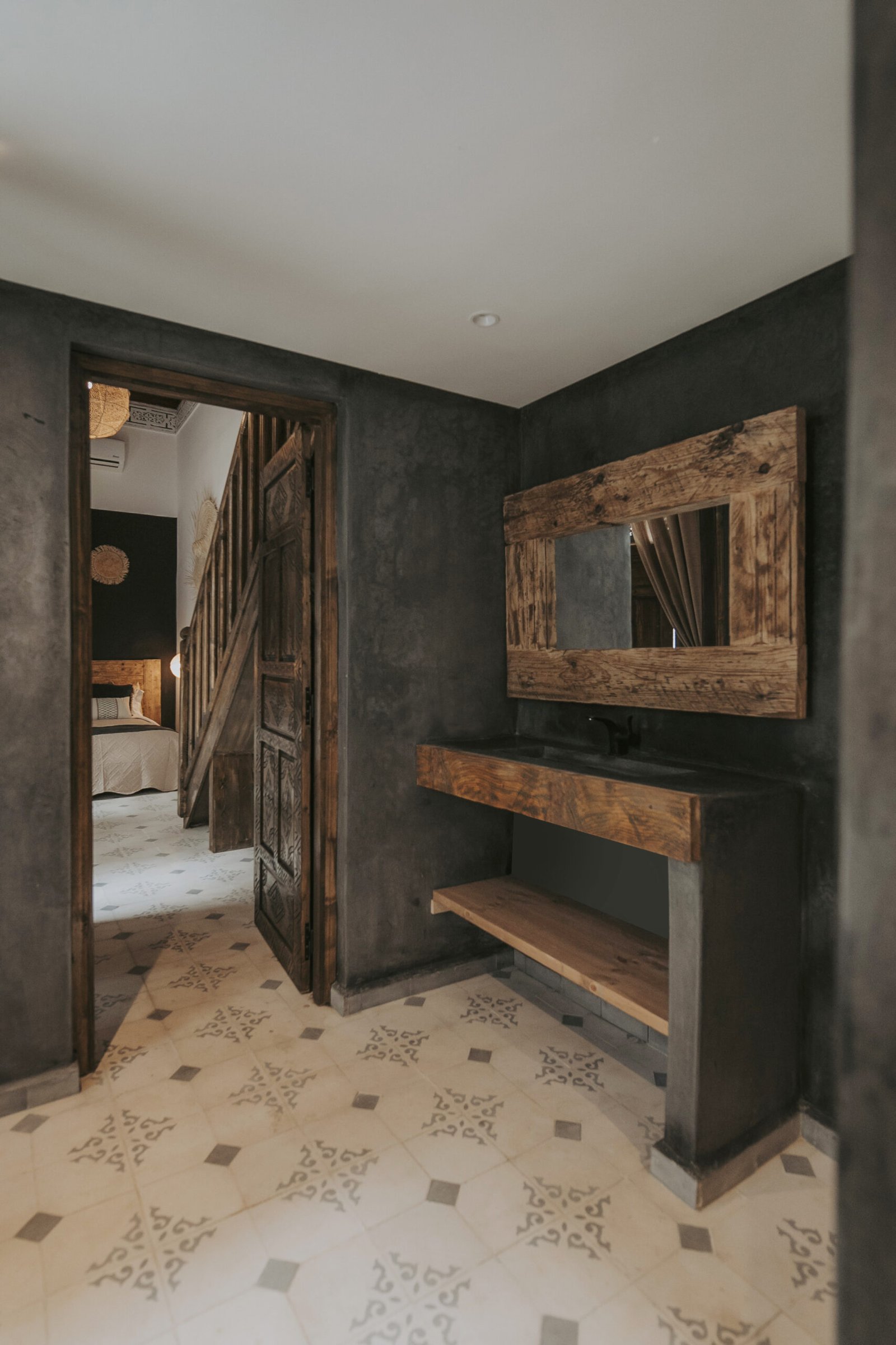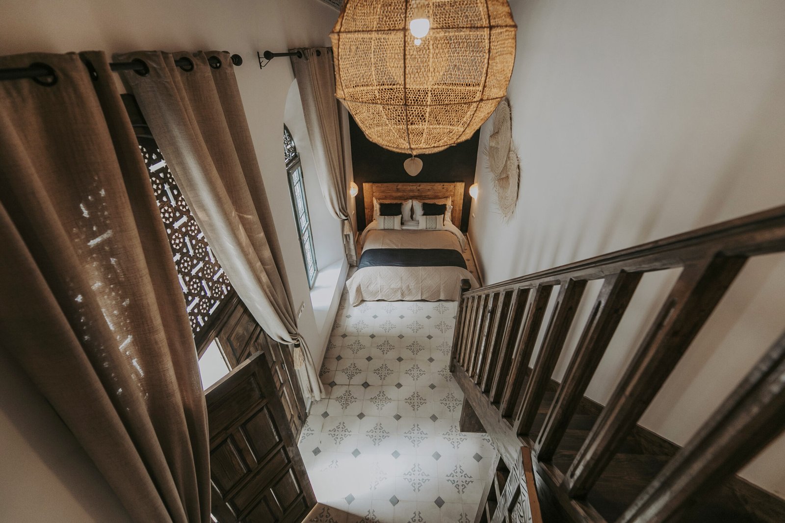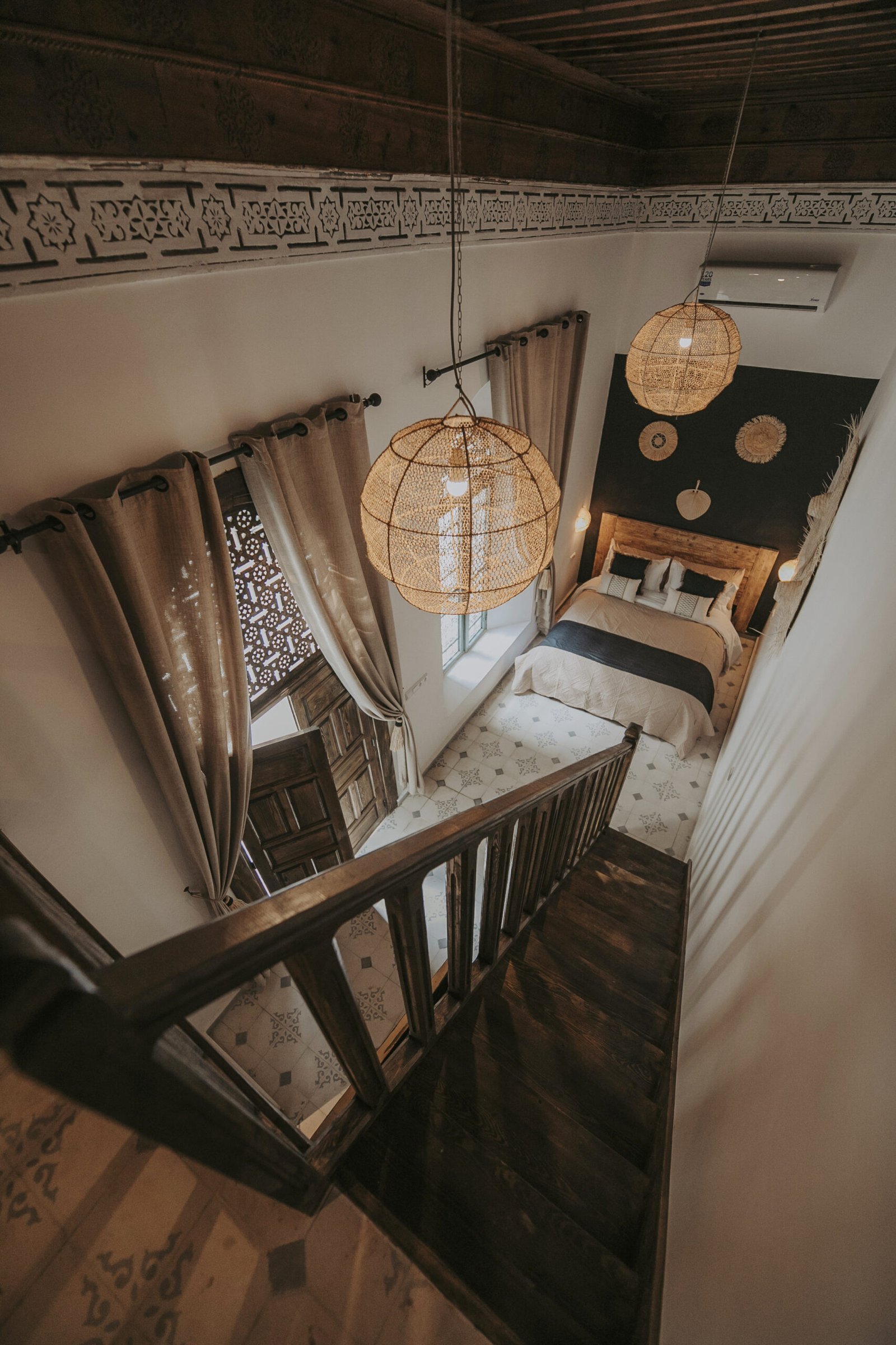 Located on the upper floor, the Toubkal Master Suite (35 m²) is a spacious and inviting duplex designed for comfort and privacy. With two queen-size beds (or four single beds on request), the room is spread over two levels, offering flexible sleeping arrangements. Warm natural tones, raw wood finishes and handwoven lighting fixtures create a serene atmosphere. The stylish, Berber-inspired bathroom completes the space beautifully.
