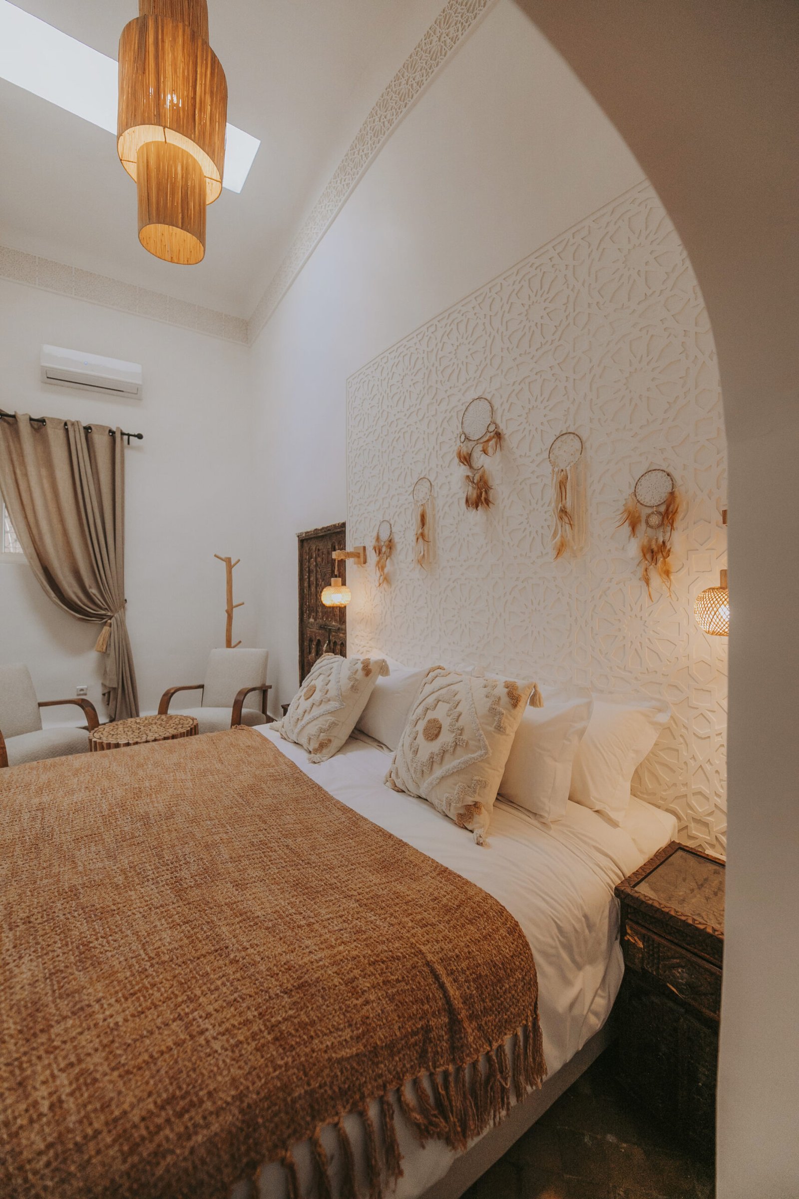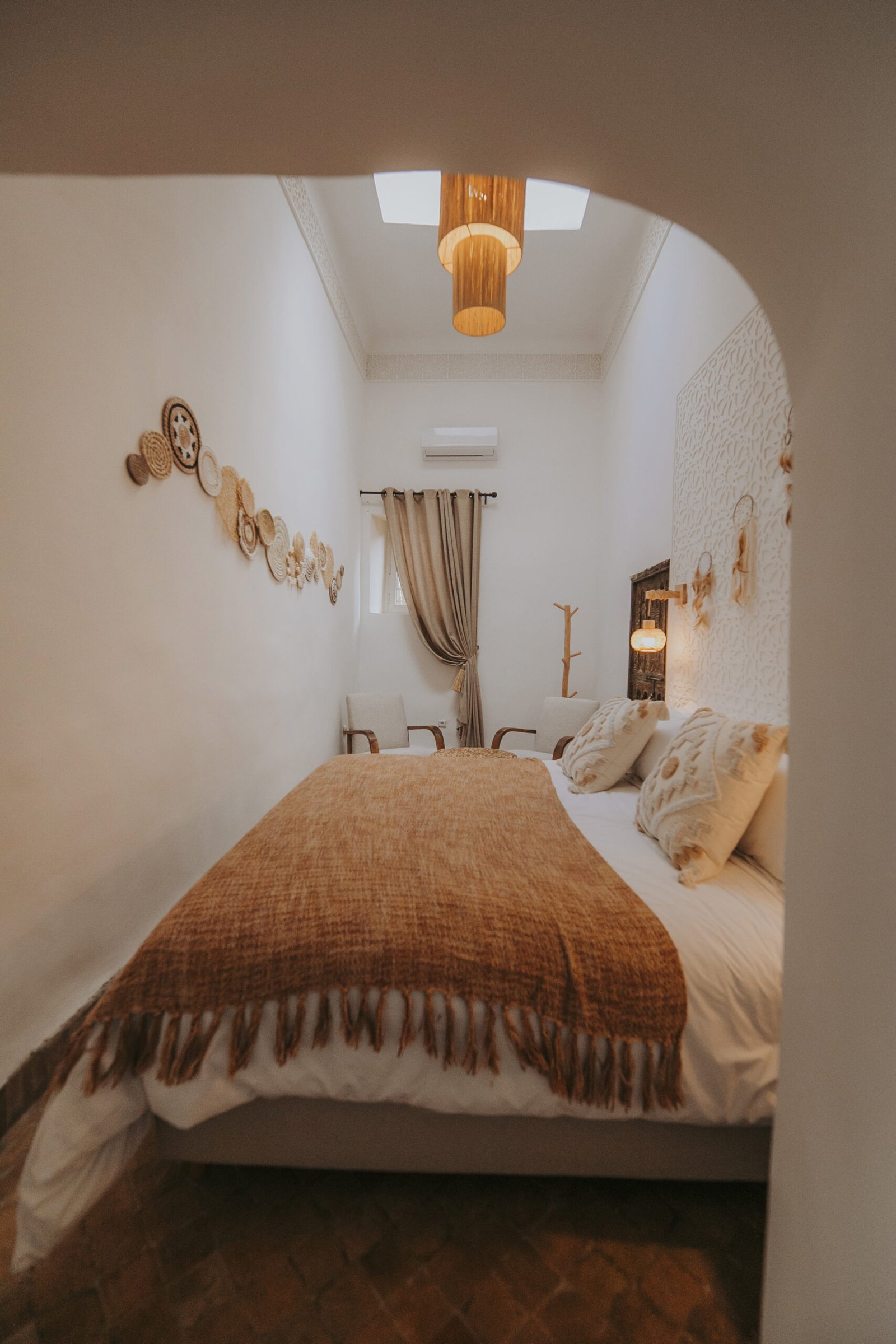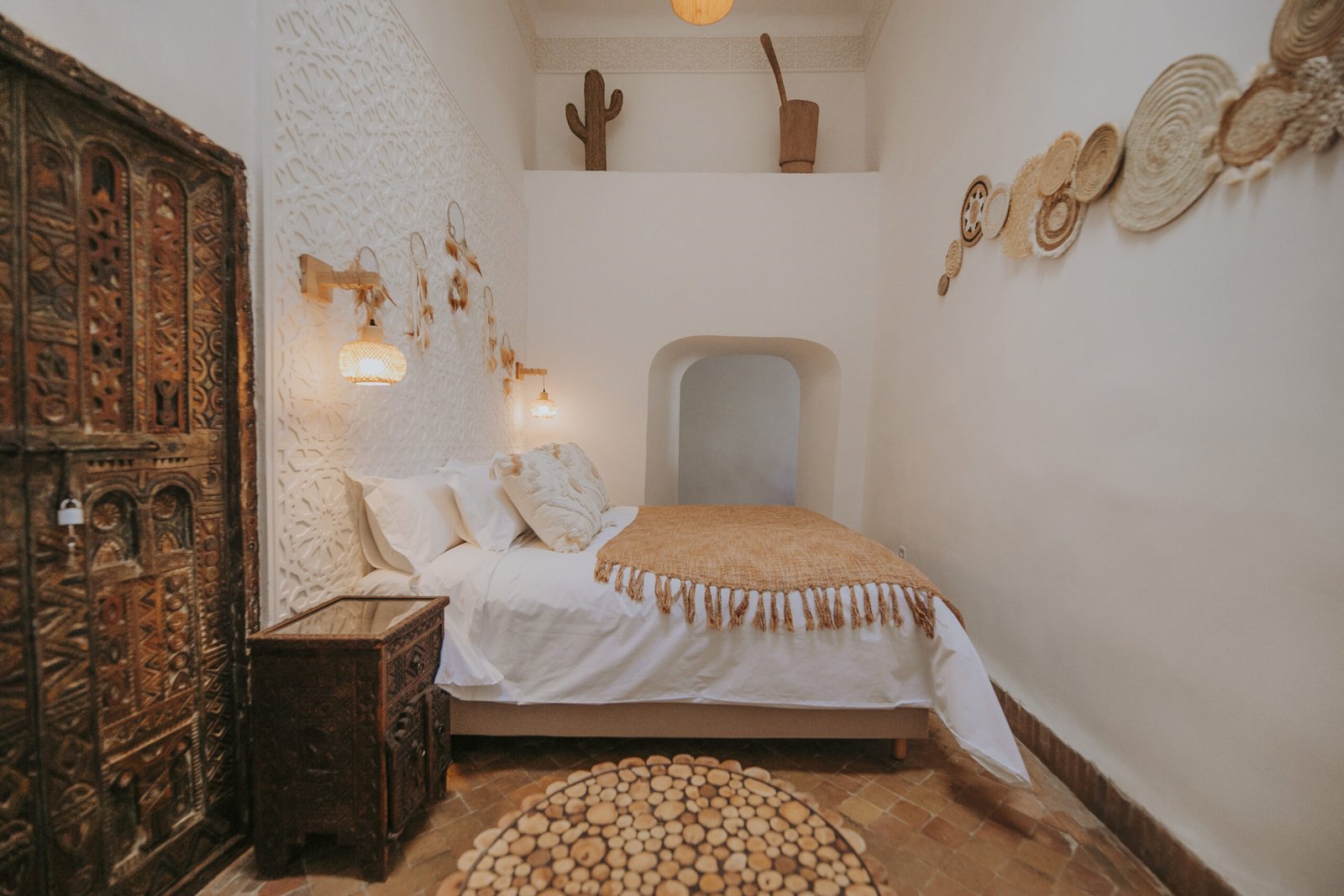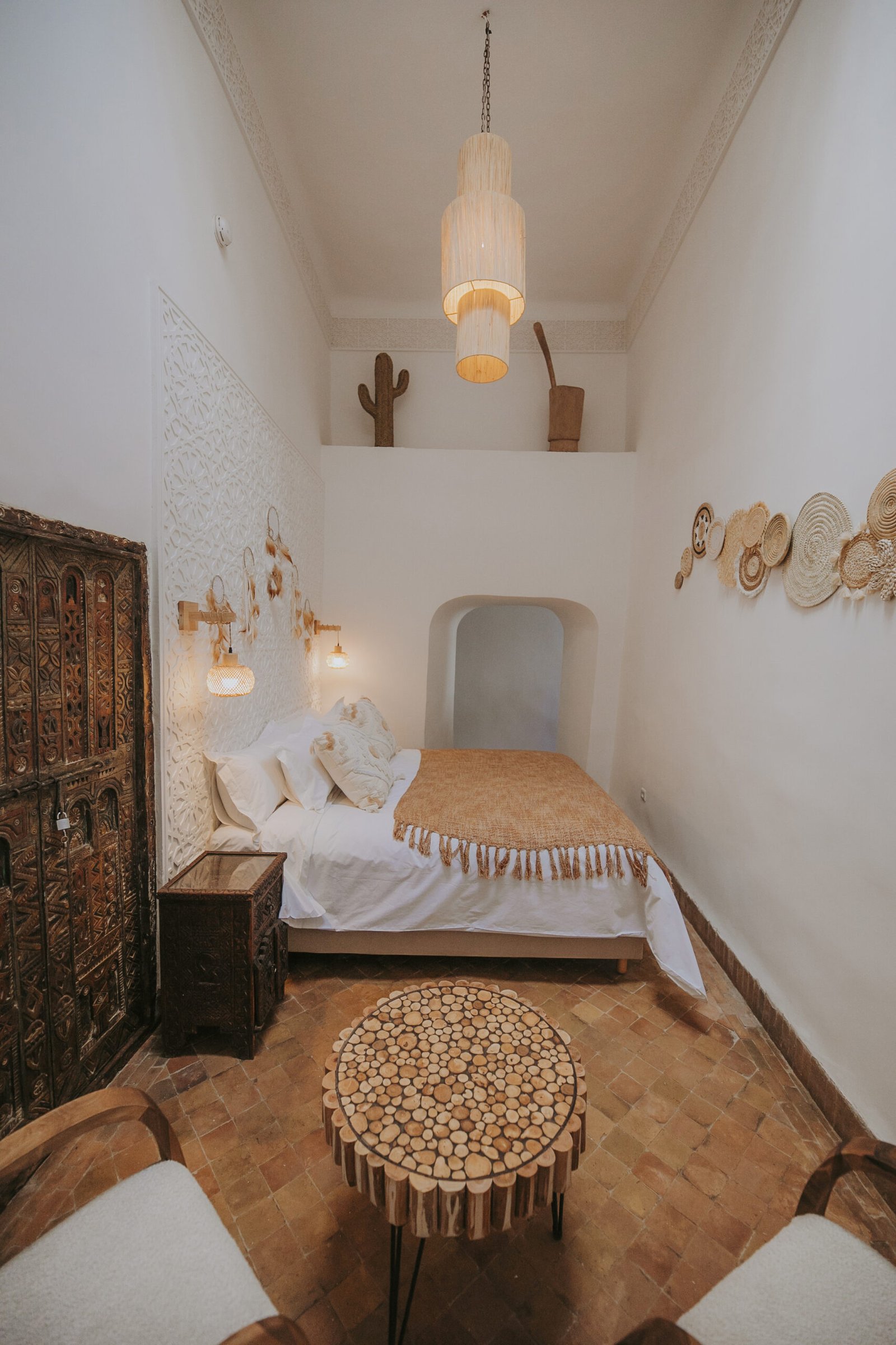 With its high ceilings and soft earthy tones, the Toudghine Deluxe Room offers an elegant and serene atmosphere. Natural materials, handcrafted decor, and a carved wooden door bring warmth and authenticity. Ideal for couples, this room is a cosy retreat after a day exploring the medina. A reading corner and delicate lighting complete the space with understated charm.